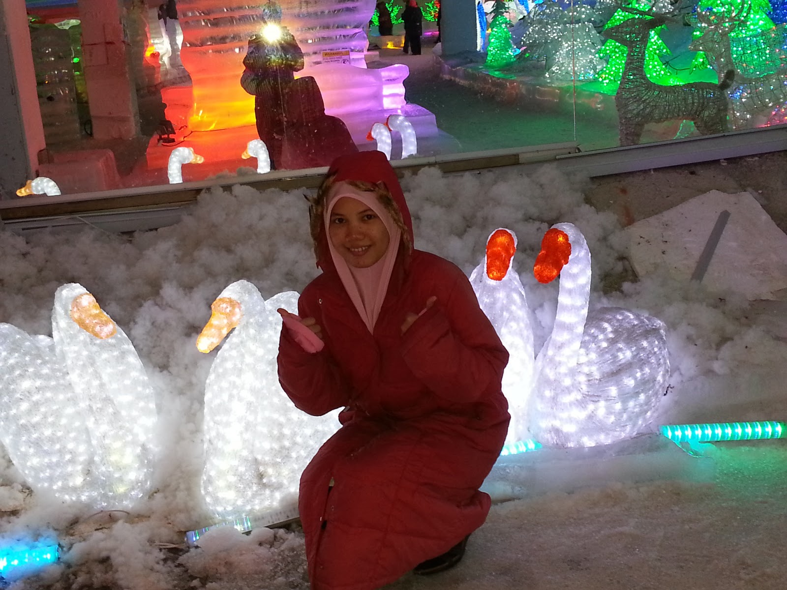 Sebenarnya last minute punya perancangan...so, xsempat untuk apply cuti untuk hari ahad tu...kalo x boleh berlama-lama skit kat sana...tujuan utama nk g survey kete kat sana...rabu tu suami ade survey kat kuantan...tp harga agak mahal kalo nk compare dgn area belah2 KL...tu yg last minute decide nk g sana....bertolak pagi jumaat coz khamis mlm tu suami masih keje...blk keje pagi tu terus gerak...4 orang sume...suami, saya, adik bongsu saya n adik ipar...dah lama xjalan jauh...seronok pulak walaupun tgh mem'buyung'...hehe...bertolak dalam pkl 9 pagi...sampai umah kakak lebih kurang pkl 4 ptg...tu pun sbb byk sgt menyinggah...kira santai2 je mkn angin...jadi kami bermalam kat umah kakak di Alam Budiman, Shah Alam...malam tu sempat lagi ke i-city...alaa...yg tempat banyak2 lampu tu...sangat cantik dan meriah...pastu amik peluang masuk ke snow walk...bayaran boleh tahan...rm35 sekepala...mula2 masuk best je rasa...nyamannn...bila dh lama skit...badan dh mula membeku...kaki pn rasa nk cramp...huhu...xtahan sejukkkkk....xsmpt nk selongkar habis...sungguh xku tahan....macam dok dalam peti ais....tp apa2 pun tetap seronok...kalo sejuk sgt blh kuar kejap panaskan badan kat luar..pastu boleh masuk balik...tp yang xsyok...lupa bw kamera...waa...rugi3...terpaksa guna hset je...so, kualiti gambar pun x berapa baik la...tapi layan jela...